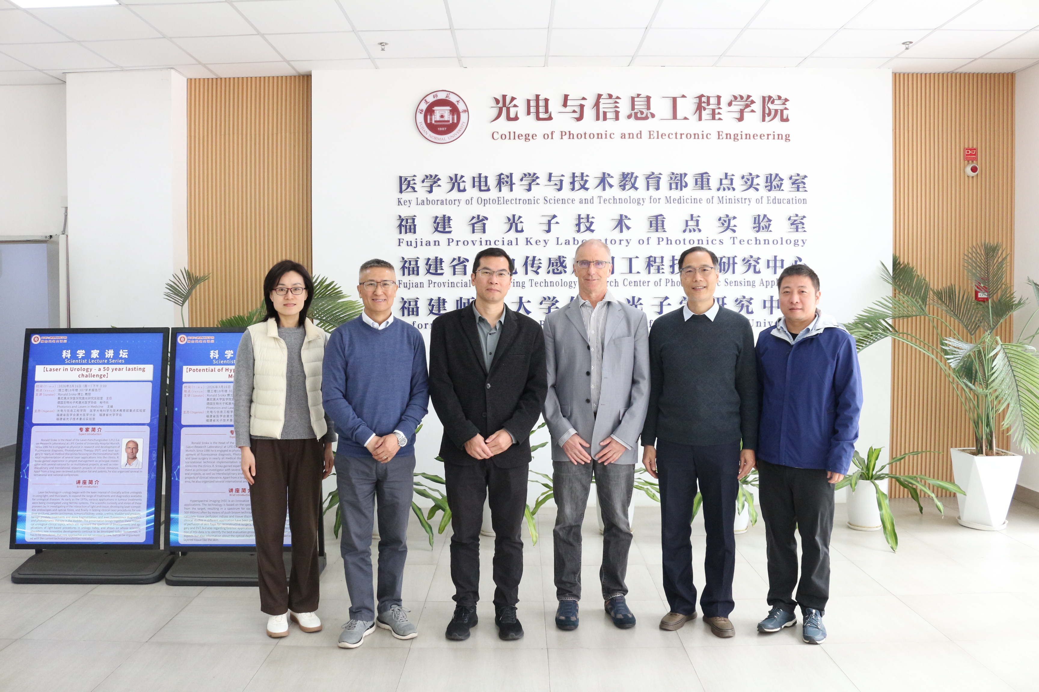 2026年3月16日,德国慕尼黑大学医学院激光研究所主任Ronald Sroka教授应邀莅临光电与信息工程学院讲学交流,并为学院老师和研究生分别作了题为《Potential of Hyperspectral-Imaging in Medicine》和《Laser in Urology - a 50 year lasting challenge》的学术报告。院长张先增教授致欢迎词,教育部重点实验室主任陈郁教授和骨干成员黄正教授分别主持两场讲座。