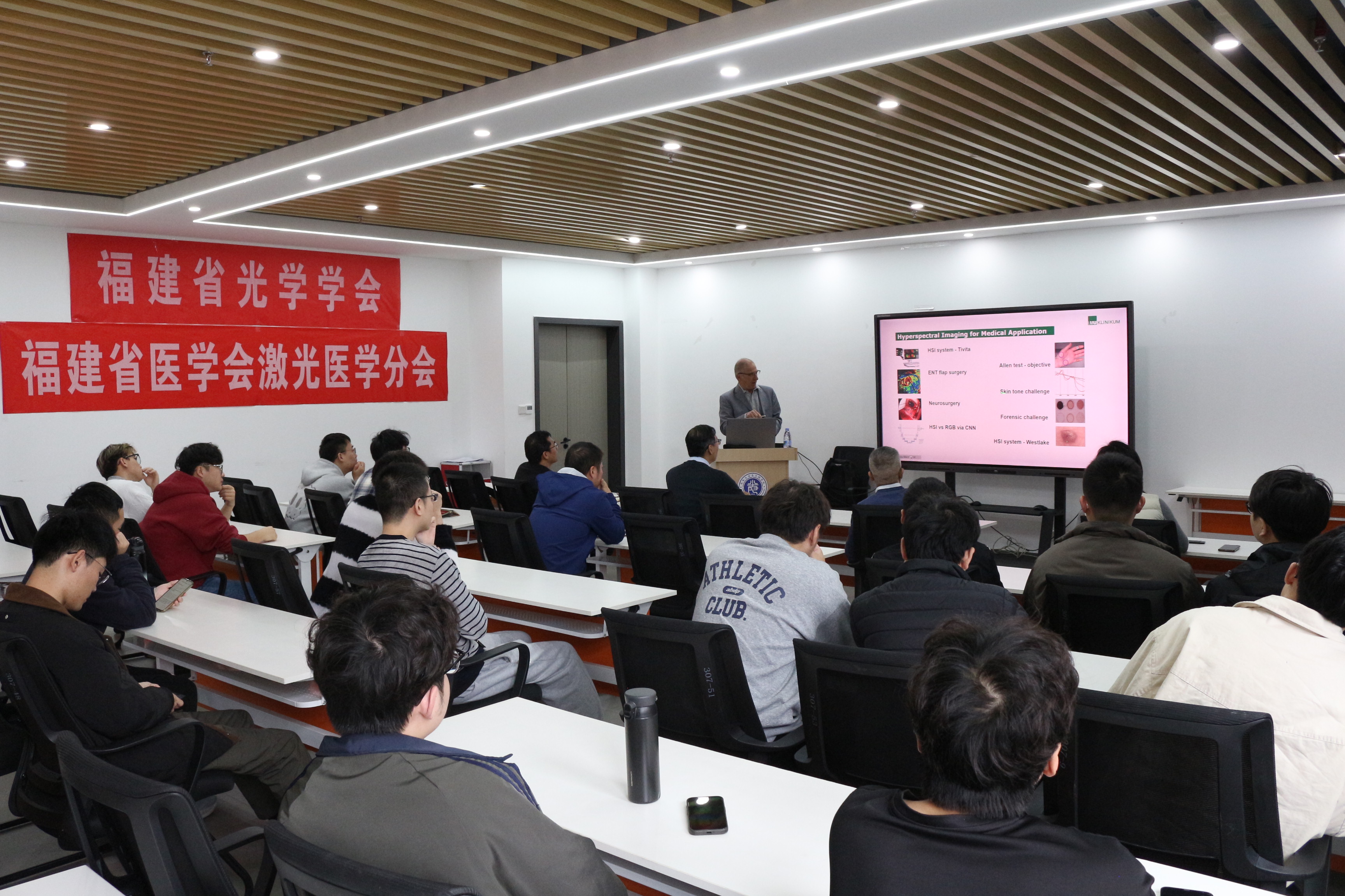 Sroka教授的报告阐释了高光谱成像的底层原理、技术路径和应用研究成果,详细介绍了激光技术在泌尿外科领域的发展历程和慕尼黑大学医学院激光研究所五十年的研究个临床转化历程。Sroka教授还结合多年经验,讨论了光-生物组织相互作用及其临床诊疗价值,强调光学研究与临床应用的转化研究的意义,并针对相关技术研究的发展进行了深入解读与前瞻展望。我院师生围绕报告内容和相关学术议题展开了交流研讨。在互动环节,Sroka教授始终以开放亲和的态度回应每一项提问,并结合其所在研究所的研究生培养体系,勉励研究生要秉持深耕细研的的学术精神。